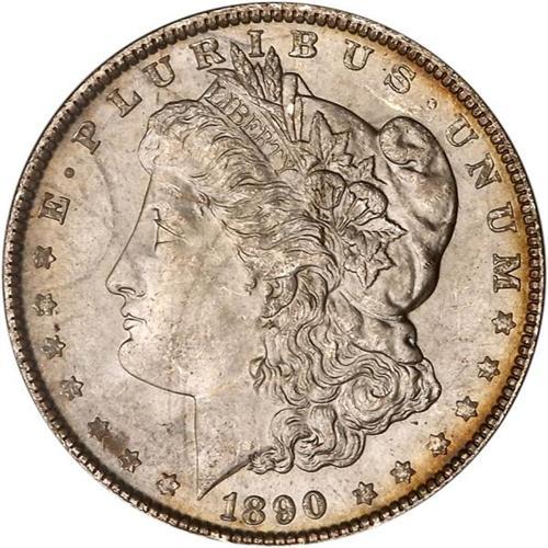 <b>1890 Morgan Dollar. PCGS graded MS65.</b> Uneven toning. A few light scuffs in the frost of Liberty's cheek. Otherwise, the streaming luster is satiny and consistent. A well struck and swirling Gem that has carefully preserved fields. Sometimes on this issue, the devices that were left by the dies turn up short of the required precision due to weak die pressure, but we find the opposite to be the case here, everything is finely detailed, including the centers <b>(PCGS # 7196)</b>