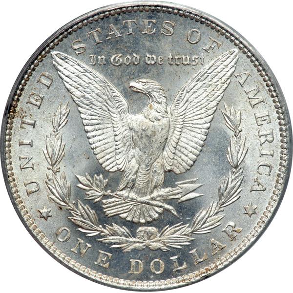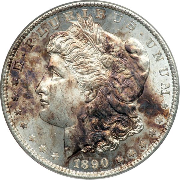 1890 Morgan Dollar. PCGS graded MS-65. Housed in an Old Green Holder. The obverse shows patchy gold toning. The fields and devices fully lustrouos -- an important and rare feature for 1890-P since not all specimens are as well preserved. The surfaces display metallic pearl-white color whose freshness draws collectors from every corner. Pop 393; 5 finer, 4 in 65+, 1 in 66 (PCGS # 7196) .