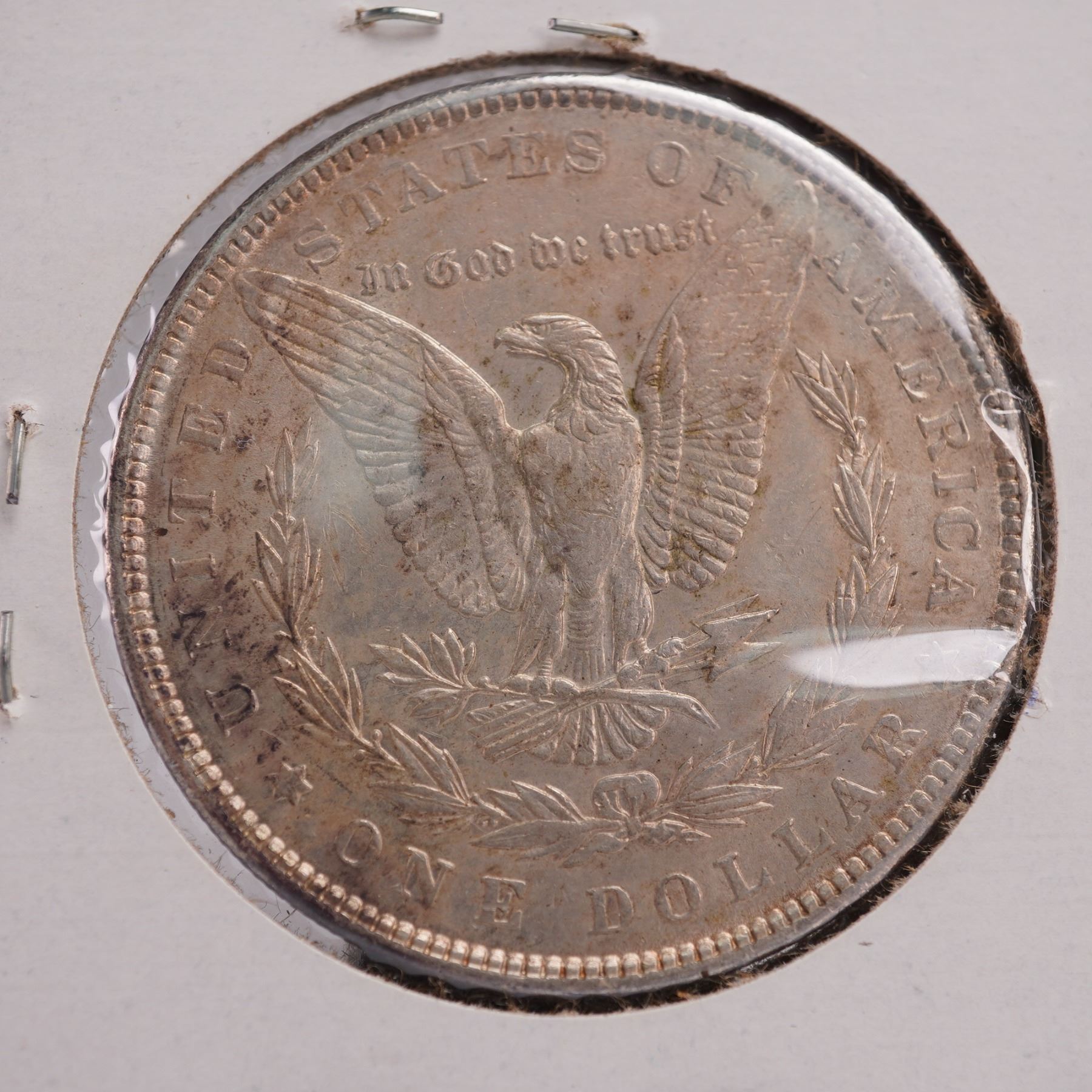 This 1890 Morgan Silver Dollar presents the iconic left-facing bust of Liberty, crowned with a tiara inscribed LIBERTY and surrounded by cotton blossoms and wheat, framed by the motto E PLURIBUS UNUM and thirteen stars with the date below along with the date 1890. The reverse features a powerfully rendered eagle with outspread wings grasping arrows and an olive branch, encompassed by a laurel wreath and the inscriptions UNITED STATES OF AMERICA, IN GOD WE TRUST, and ONE DOLLAR. Enclosed in a cardboard holder. Holder measures: 2"L x 2"H. Coin diameter: 38.1 mm.