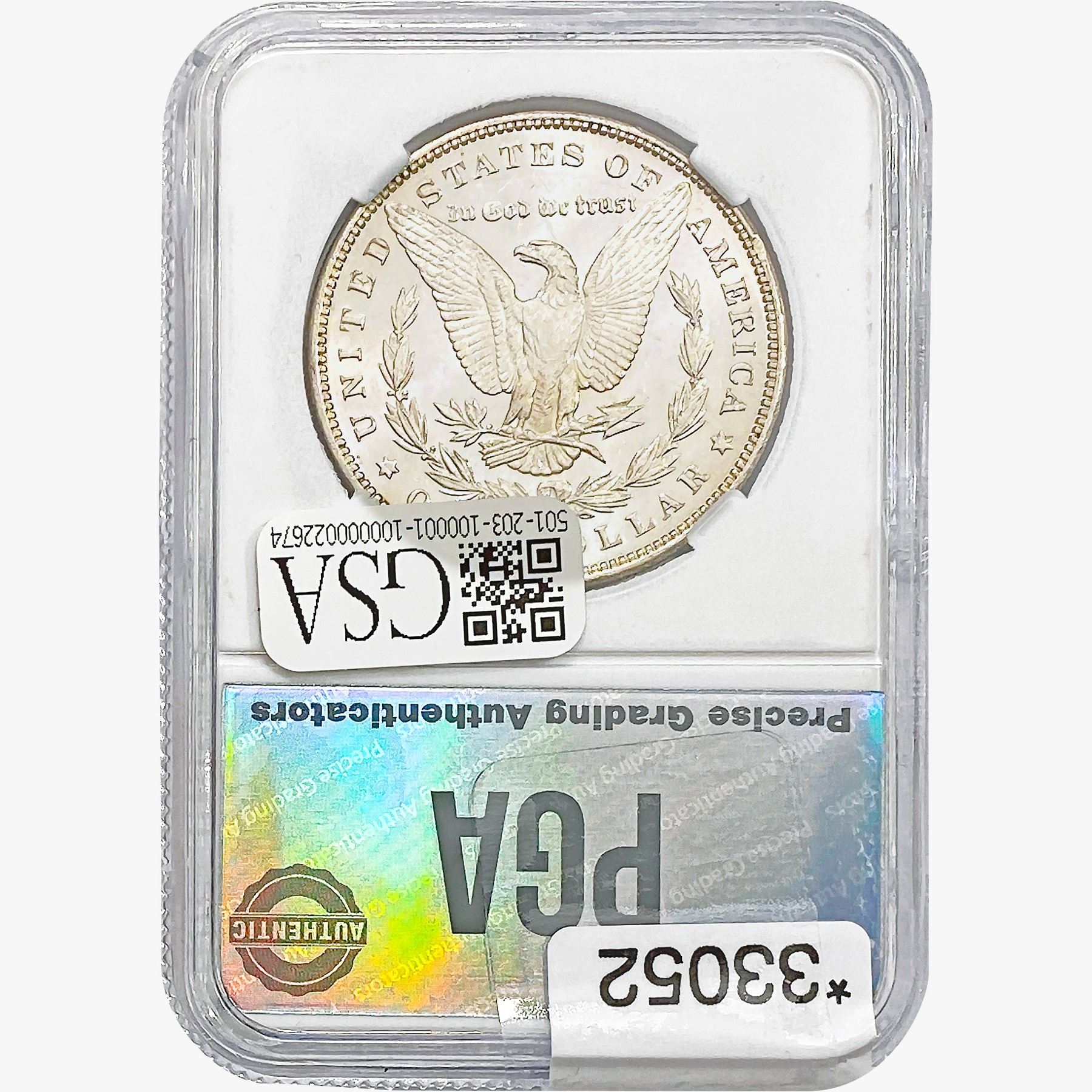 COINS AND CURRENCY LISTED IN GSA’S CATALOG AS GRADED AND ENCAPSULATED BY PCGS, NGC, ANACS, ICG, PCGS CURRENCY, PMG, PCGS BANKNOTE GRADING, CMC OR ANY OTHER THIRD-PARTY GRADING SERVICE ARE LIKEWISE SOLD “AS-IS” EXCEPT AS EXPRESSLY SET FORTH HEREIN. ALL THIRD-PARTY GRADING SERVICE GUARANTEES, INCLUDING AUTHENTICITY, ARE THE SOLE RESPONSIBILITY OF THE THIRD-PARTY GRADING SERVICE AND NOT WARRANTIES OR GUARANTEES OF GSA. BIDDERS SHOULD CONTACT THESE THIRD-PARTY GRADING SERVICES DIRECTLY WITH RESPECT TO ANY CLAIMS OR QUESTIONS THEY MAY HAVE CONCERNING THEIR GUARANTEES AND WARRANTIES. BIDDERS ACKNOWLEDGE AND AGREE THAT AUCTIONEER IS NOT BOUND BY OR LIABLE FOR ANY OPINION OR CERTIFICATION BY ANY THIRD-PARTY GRADING SERVICE. REMOVAL OF A PRODUCT FROM ITS PROTECTIVE CASING OR HOLDER OR ALTERATION OF ANY COIN HOLDER WAIVES ALL RIGHTS CONCERNING THE PRODUCT CONTAINED THEREIN.