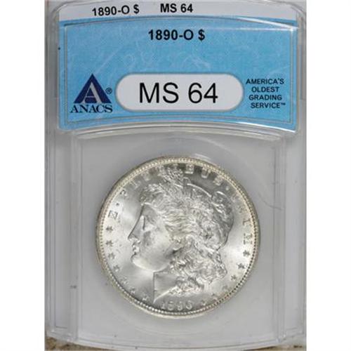<B>1890-O $1 MS64 ANACS.</B></I> NGC Census: (2101/148). PCGS Population (2454/358). Mintage: 10,701,000. Numismedia Wsl. Price for NGC/PCGS coin in MS64: $280. (#7200)<BR><BR><B>Coin Engraver:</B> George T. Morgan<BR><BR><b>Shipping:</b> Coins & Currency (<a target="_blank" href="http://www.heritageauctions.com/common/shipping.php">view shipping information</a>\)