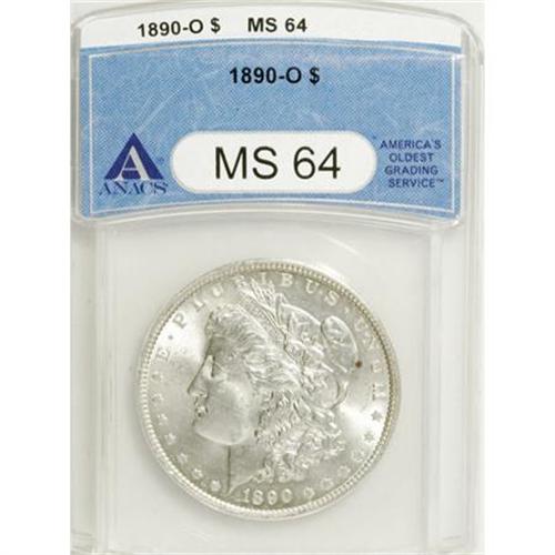 <B>1890-O $1 MS64 ANACS.</B></I> NGC Census: (2116/151). PCGS Population (2586/403). Mintage: 10,701,000. Numismedia Wsl. Price for NGC/PCGS coin in MS64: $280. (#7200)<BR><BR><B>Coin Engraver:</B> George T. Morgan<BR><BR><b>Shipping:</b> Coins & Currency (<a target="_blank" href="http://www.heritageauctions.com/common/shipping.php">view shipping information</a>)