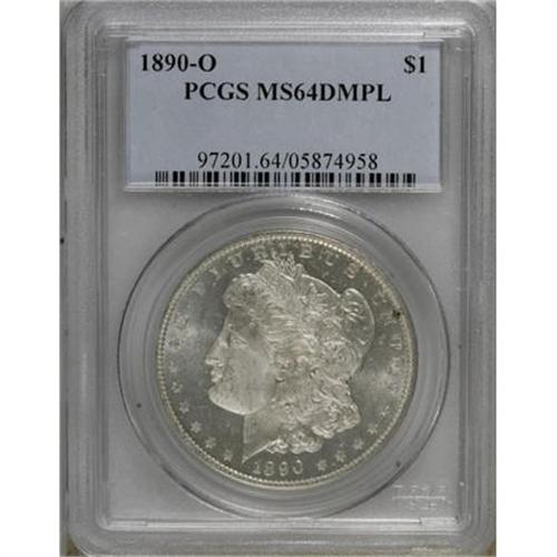 <B>1890-O $1 MS64 Deep Mirror Prooflike PCGS.</B></I> This untoned near-Gem displays typical New Orleans Mint softness on the hair detail above Liberty's ear, but the other design elements are boldly struck and the fields exhibit impressive deep mirror reflectivity on both sides. Small, scattered abrasions keep it from grading even higher. This issue is scarce at the current grade level in either Prooflike or Deep Mirror Prooflike condition. <BR><BR><b>Shipping:</b> Coins & Currency (<a target="_blank" href="http://www.heritageauctions.com/common/shipping.php">view shipping information</a>)