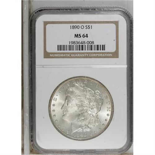 <B>1890-O $1 MS64 NGC.</B></I> NGC Census: (2087/148). PCGS Population (2454/358). Mintage: 10,701,000. Numismedia Wsl. Price for NGC/PCGS coin in MS64: $288. (#7200)<BR><BR><b>Shipping:</b> Coins & Currency (<a target="_blank" href="http://www.heritageauctions.com/common/shipping.php">view shipping information</a>)