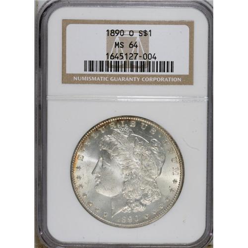 <B>1890-O $1 MS64 NGC.</B></I> NGC Census: (4146/294). PCGS Population (2457/358). Mintage: 10,701,000. Numismedia Wsl. Price for NGC/PCGS coin in MS64: $288. (#7200)<BR><BR><b>Shipping:</b> Coins & Currency (<a target="_blank" href="http://www.heritageauctions.com/common/shipping.php">view shipping information</a>)