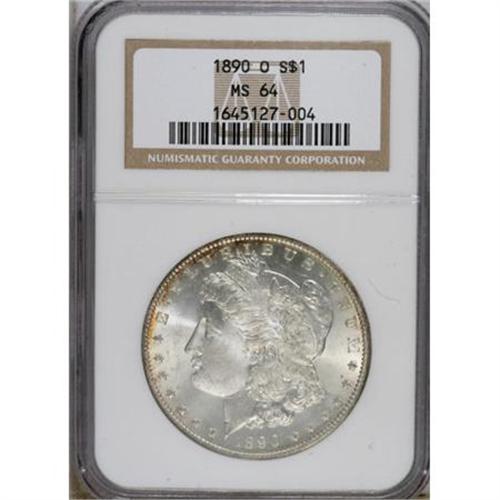 <B>1890-O $1 MS64 NGC.</B></I> NGC Census: (2108/151). PCGS Population (2533/383). Mintage: 10,701,000. Numismedia Wsl. Price for NGC/PCGS coin in MS64: $280. (#7200)<BR><BR><B>Coin Engraver:</B> George T. Morgan<BR><BR><b>Shipping:</b> Coins & Currency (<a target="_blank" href="http://www.heritageauctions.com/common/shipping.php">view shipping information</a>)