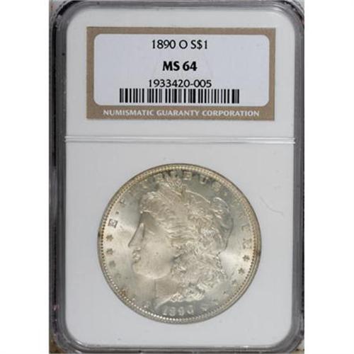 <B>1890-O $1 MS64 NGC.</B></I> NGC Census: (2108/151). PCGS Population (2537/387). Mintage: 10,701,000. Numismedia Wsl. Price for NGC/PCGS coin in MS64: $280. (#7200)<BR><BR><B>Coin Engraver:</B> George T. Morgan<BR><BR><b>Shipping:</b> Coins & Currency (<a target="_blank" href="http://www.heritageauctions.com/common/shipping.php">view shipping information</a>)