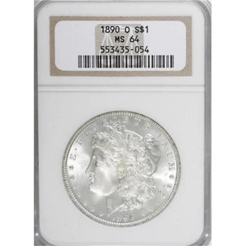 <B>1890-O $1 MS64 NGC.</B></I> NGC Census: (2162/147). PCGS Population (2786/431). Mintage: 10,701,000. Numismedia Wsl. Price for NGC/PCGS coin in MS64: $270. (#7200)<BR><BR><B>Coin Engraver:</B> George T. Morgan<BR><BR><b>Shipping:</b> Coins & Currency (<a target="_blank" href="http://www.heritageauctions.com/common/shipping.php">view shipping information</a>)