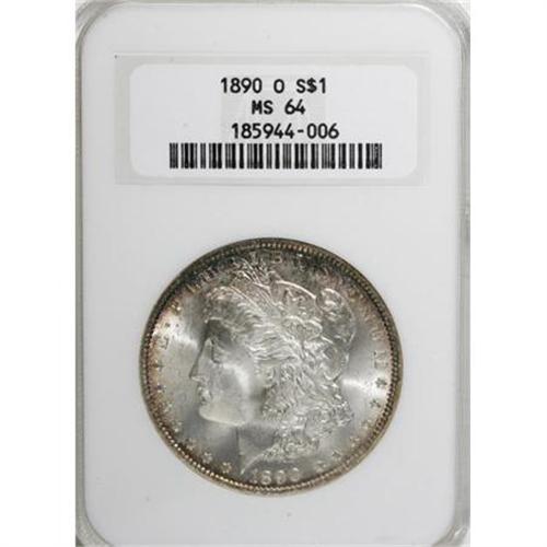 <B>1890-O $1 MS64 NGC.</B></I> NGC Census: (2163/147). PCGS Population (2788/432). Mintage: 10,701,000. Numismedia Wsl. Price for NGC/PCGS coin in MS64: $270. (#7200)<BR><BR><B>Coin Engraver:</B> George T. Morgan<BR><BR><b>Shipping:</b> Coins & Currency (<a target="_blank" href="http://www.heritageauctions.com/common/shipping.php">view shipping information</a>)