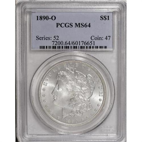 <B>1890-O $1 MS64 PCGS.</B></I> . PCGS Population (2753/420). NGC Census: (2143/148). Mintage: 10,701,000. Numismedia Wsl. Price for NGC/PCGS coin in MS64: $270. (#7200)<BR><BR><B>Coin Engraver:</B> George T. Morgan<BR><BR><b>Shipping:</b> Coins & Currency (<a target="_blank" href="http://www.heritageauctions.com/common/shipping.php">view shipping information</a>)