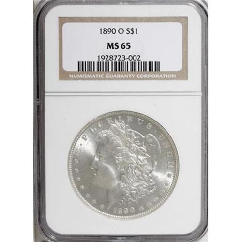 <B>1890-O $1 MS65 NGC.</B></I> Glowing luster exudes from the untoned surfaces of this Gem. Relatively well struck, with no marks out of context with the grade designation.<BR><I>From The Silver Spur Collection of Morgan Dollars.</B></I><BR><BR><B>Coin Engraver:</B> George T. Morgan<BR><BR><b>Shipping:</b> Coins & Currency (<a target="_blank" href="http://www.heritageauctions.com/common/shipping.php">view shipping information</a>)