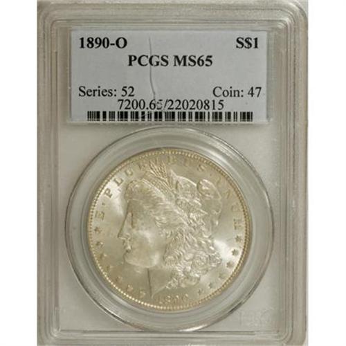 <B>1890-O $1 MS65 PCGS.</B></I> Highly lustrous with traces of gold toning on mostly untoned, creamy-white surfaces. Boldly struck save for flatness in the hair detail just above Liberty's ear. A few scattered marks are noted, along with some faint roller marks across Liberty's lower cheek, jaw, and ear. <BR><BR><B>Coin Engraver:</B> George T. Morgan<BR><BR><b>Shipping:</b> Coins & Currency (<a target="_blank" href="http://www.heritageauctions.com/common/shipping.php">view shipping information</a>)