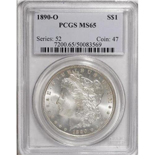 <B>1890-O $1 MS65 PCGS.</B></I> A vibrant, wholly original example, typically softly struck in the centers and virtually untoned, with very few marks on either side. <BR><BR><B>Coin Engraver:</B> George T. Morgan<BR><BR><b>Shipping:</b> Coins & Currency (<a target="_blank" href="http://www.heritageauctions.com/common/shipping.php">view shipping information</a>)