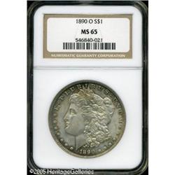 <B>1890-O<img border='0' src='http://www.heritagecoins.com/images/star.gif' width=10 height=10>$1 MS65 NGC.</B></I> Adequately struck, save for the hair above Liberty's ear and the eagle's breast. Touches of electric-blue and russet peripheral toning on the obverse, and a lightly multitoned reverse. Lot:10336