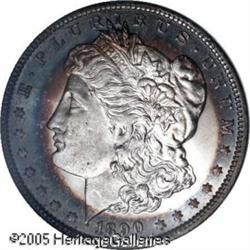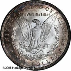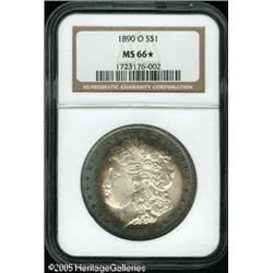 <B>1890-O<img border='0' src='http://www.heritagecoins.com/images/star.gif' width=10 height=10>$1 MS66 <img border='0' src='http://www.heritagecoins.com/images/star.gif' width=10 height=10> NGC.</B></I> Apple-green, apricot, electric-blue, and mauve colors enrich the peripheries. The brilliant centers are not completely brought up, as is usual for this strike challenged issue, but the eye appeal is substantial. Available in lower Mint State grades, the 1890-O is rarely encountered above the MS65 level. Population: 2 in 66 <img border='0' src='http://www.heritagecoins.com/images/star.gif' width=10 height=10>, none finer (1/05).<BR><I>From The Banks Collection.</B></I> Lot:10337