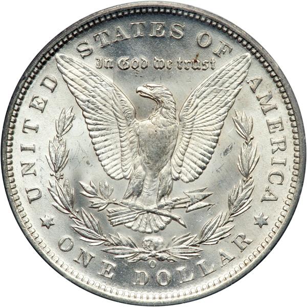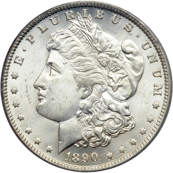 1890-O Morgan Dollar. PCGS graded MS-65. A frosty totally white gem example. This is a gorgeous representative of this challenging O-mint year. The obverse and reverse are silvery from the center to the border with full Gem-quality cartwheel luster. A few bagmarks are seen in the obverse field. This is a generally well-struck example with good details. It has no bothersome flat areas on Liberty or the eagle but as is often the case, the dies left their partly rigid impression behind with some modest weakness or imprecision only at the centers. Pop 410; 19 in 66 (PCGS # 7200) .