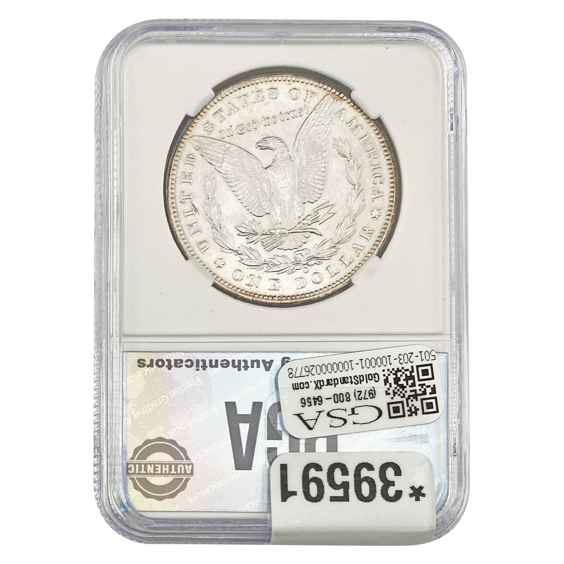l. All non-certified coins and currency are guaranteed genuine, but are not guaranteed as to grade, since grading is a matter of opinion, an art and not a science, and therefore the description rendered by GSA or any third-party grading service may not agree with the opinion of others (including trained experts), and the same expert may not grade the same item with the same grade at two different times. GSA may, but is not obligated to, express an opinion as to non-certified numismatic items, in GSA’s opinion, or by its employees’ experience and the current interpretation of the American Numismatic Association’s standards as of the date the catalog was prepared. There is no guarantee or warranty expressed or implied that the grading opinions utilized by GSA, if any, will meet the standards of any grading service at any time in the future.