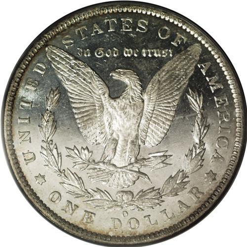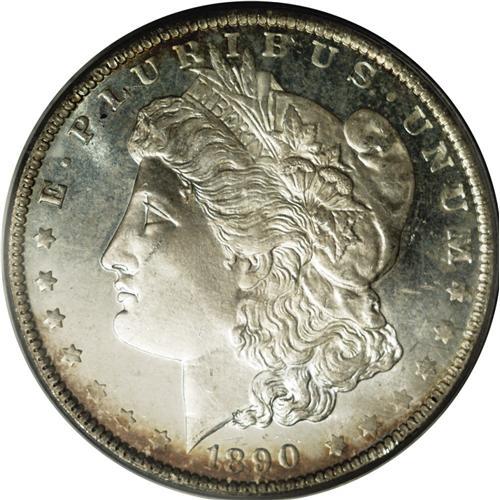 <B>1890-O<img border='0' src='http://www.heritagecoins.com/images/star.gif' width=10 height=10>$1> MS65 Deep Mirror Prooflike PCGS.</B></I> Like the 1889-O, the 1890-O is apt to be offered at the MS60-63 grade ranges with deficient luster and poorly struck features. Furthermore, neither issue is common with the attractive combination of a Deep Mirror Prooflike finish and Gem quality surfaces. The present example is well frosted over the central devices with shimmering, glassy fields. The strike, while uncommonly bold in the centers for the issue, wanes slightly on the central highpoints. Still, with relatively few abrasions and attractive reddish-magenta peripheral iridescence, this conditionally rare example is sure to elicit strong bids from specialists. NGC and PCGS combined have seen just 25 coins in MS65 DMPL, with one finer (5/06).