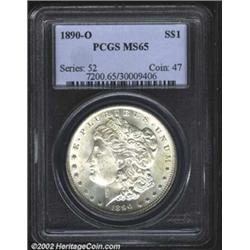 1890-O S$1 MS65 PCGS. A spike (as struck) emerges from the left side of the eagle's neck. A lustrous and lightly toned Gem that has a typical strike. The left obverse border has a faint fingerprint. Important notice: We expect to be auctioning lots at the rate of 200-250 per hour. Sometimes eBay Premier live bid software cannot keep up with that pace, so we strongly recommend that you place a realistic proxy bid now as insurance to avoid disappointment. Also please note that all Heritage/CAA lots purchased through eBay Premier carry a 20% Buyer's Premium. Please make sure you read the Terms and Conditions.