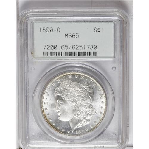 <B>1890-O<img border='0' src='http://www.heritagecoins.com/images/star.gif' width=10 height=10>$1> MS65 PCGS.</B></I> Dazzling luster and peripheral pumpkin-gold toning affirm the eye appeal. Beautifully preserved, and sharply struck for this usually mushy O-mint issue. Housed in an early generation holder.