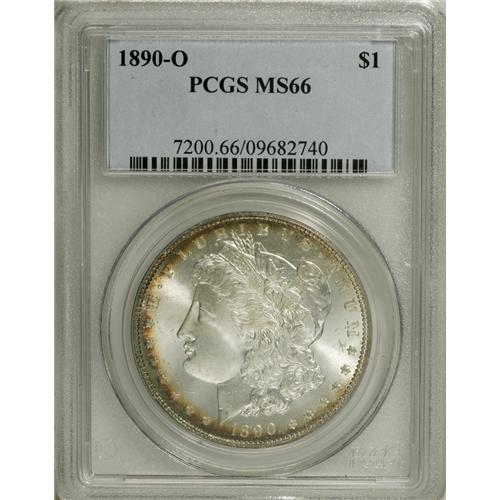 <B>1890-O S$1 MS66 PCGS.</B></I> The surprisingly full striking details are unusually crisp for a New Orleans Mint product, especially on the hair detail just above Liberty's ear and on the eagle's breast feathers. Intense cartwheel luster shimmers over each side, and alluring golden-brown, russet-red, and sea-green peripheral toning further elevates the visual appeal of the piece. Few O-mint dollars can match the beauty of this minimally abraded Premium Gem. Population: 18 in 66, 0 finer (12/06).<BR><BR><b>Shipping:</b> Coins & Currency (<a target="_blank" href="http://www.heritageauctions.com/common/shipping.php">view shipping information</a>)