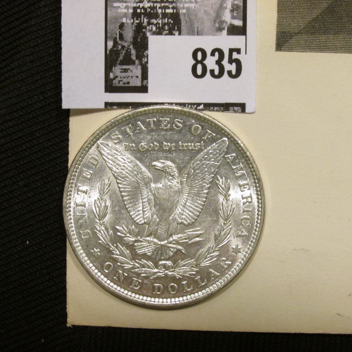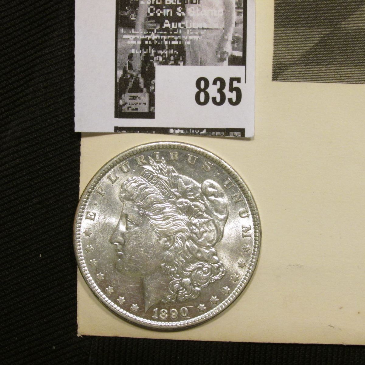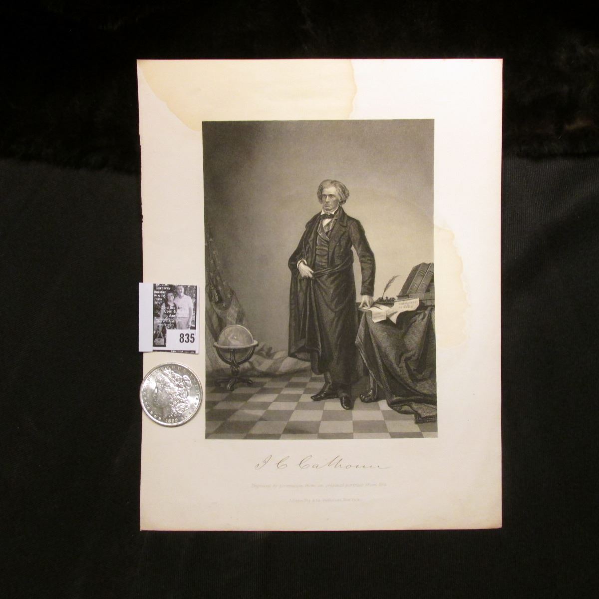 1890 P Morgan Silver Dollar Brilliant Uncirculated; and a black & white print of J.C. Calhoun, with