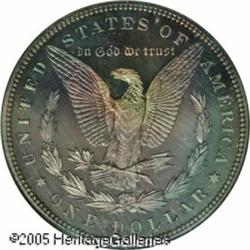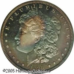 <B>1890<img border='0' src='http://www.heritagecoins.com/images/star.gif' width=10 height=10>$1 PR66 Cameo NGC.</B></I> A stunning match to the other silver proof coins offered in this sale, this Morgan dollar has deep blue peripheral toning clear to the center of her head which is a dusky rose gold color. The reverse is perfectly matched and very colorful as well. Excellent surfaces as expected for the grade, and a delightful coin to behold. Although not technically the finest, this is certainly one of the more eye appealing examples to survive. Population: 22 in 66, 13 finer (1/05). Lot:10659