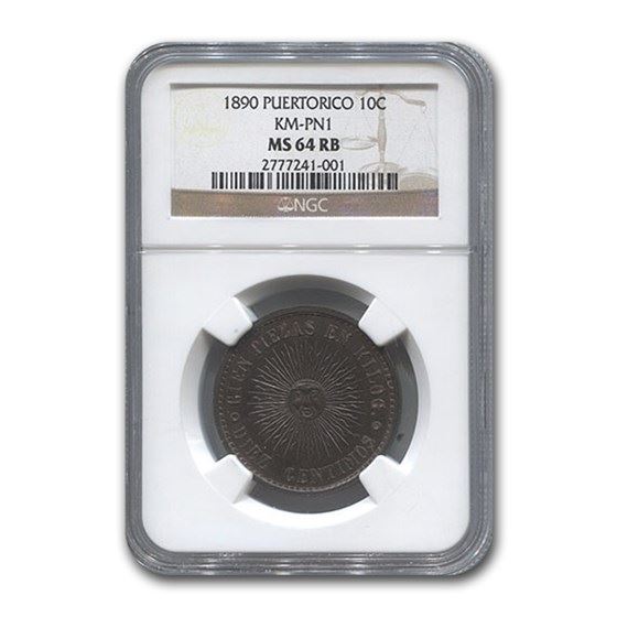 One piece 1890 Puerto Rico Copper 10 Centimos MS-64 NGC (RB)