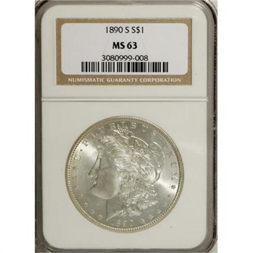 <B>1890-S $1 MS63 NGC.</B></I> NGC Census: (2017/2057). PCGS Population (2510/2890). Mintage: 8,230,373. Numismedia Wsl. Price for NGC/PCGS coin in MS63: $96. (#7202)<BR><BR><B>Coin Engraver:</B> George T. Morgan<BR><BR><b>Shipping:</b> Coins & Currency (<a target="_blank" href="http://www.heritageauctions.com/common/shipping.php">view shipping information</a>\)