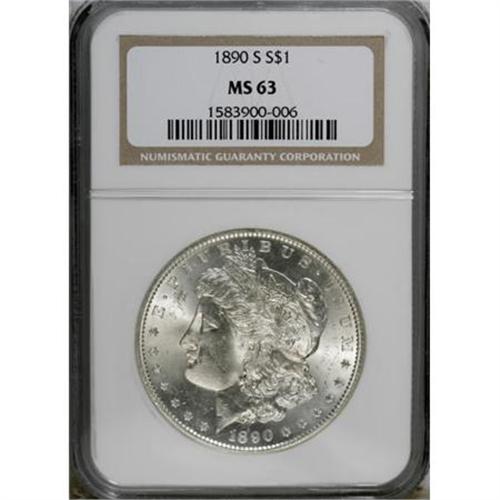<B>1890-S $1 MS63 NGC.</B></I> NGC Census: (2056/2091). PCGS Population (2549/2975). Mintage: 8,230,373. Numismedia Wsl. Price for NGC/PCGS coin in MS63: $96. (#7202)<BR><BR><B>Coin Engraver:</B> George T. Morgan<BR><BR><b>Shipping:</b> Coins & Currency (<a target="_blank" href="http://www.heritageauctions.com/common/shipping.php">view shipping information</a>)