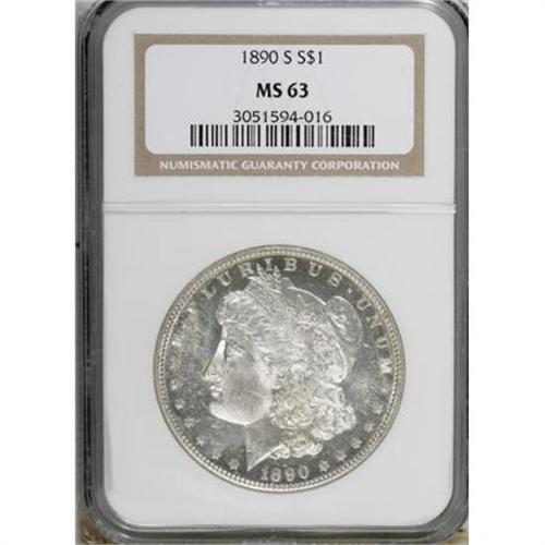 <B>1890-S $1 MS63 NGC.</B></I> NGC Census: (2059/2099). PCGS Population (2552/2985). Mintage: 8,230,373. Numismedia Wsl. Price for NGC/PCGS coin in MS63: $96. (#7202)<BR><BR><B>Coin Engraver:</B> George T. Morgan<BR><BR><b>Shipping:</b> Coins & Currency (<a target="_blank" href="http://www.heritageauctions.com/common/shipping.php">view shipping information</a>)