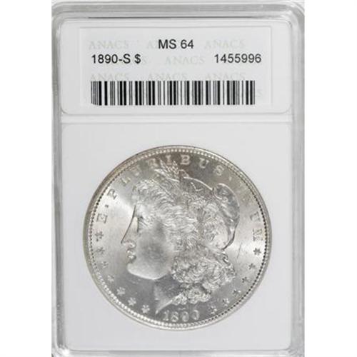<B>1890-S $1 MS64 ANACS.</B></I> NGC Census: (1734/320). PCGS Population (2220/640). Mintage: 8,230,373. Numismedia Wsl. Price for NGC/PCGS coin in MS64: $220. (#7202)<BR><BR><B>Coin Engraver:</B> George T. Morgan<BR><BR><b>Shipping:</b> Coins & Currency (<a target="_blank" href="http://www.heritageauctions.com/common/shipping.php">view shipping information</a>\)