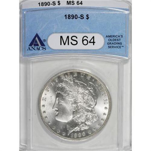 <B>1890-S $1 MS64 ANACS.</B></I> NGC Census: (1745/322). PCGS Population (2268/654). Mintage: 8,230,373. Numismedia Wsl. Price for NGC/PCGS coin in MS64: $220. (#7202)<BR><BR><B>Coin Engraver:</B> George T. Morgan<BR><BR><b>Shipping:</b> Coins & Currency (<a target="_blank" href="http://www.heritageauctions.com/common/shipping.php">view shipping information</a>)