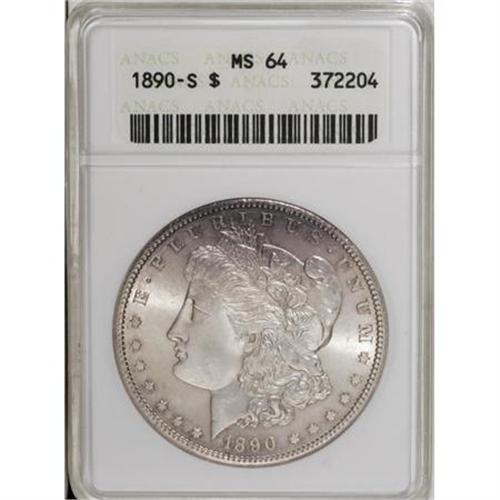 <B>1890-S $1 MS64 ANACS.</B></I> . NGC Census: (1779/325). PCGS Population (2328/670). Mintage: 8,230,373. Numismedia Wsl. Price for NGC/PCGS coin in MS64: $215. (#7202)<BR><BR><B>Coin Engraver:</B> George T. Morgan<BR><BR><b>Shipping:</b> Coins & Currency (<a target="_blank" href="http://www.heritageauctions.com/common/shipping.php">view shipping information</a>)