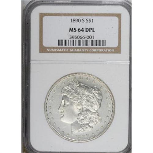 <B>1890-S $1 MS64 Deep Mirror Prooflike NGC.</B></I> Brilliant with deep, glassy reflectivity throughout. This issue is quite elusive with a Deep Mirror Prooflike finish, especially above the MS 63 level, as shown by current population data from NGC and PCGS. Census: 30 in 64, 5 finer (10/07).<BR><BR><b>Shipping:</b> Coins & Currency (<a target="_blank" href="http://www.heritageauctions.com/common/shipping.php">view shipping information</a>)