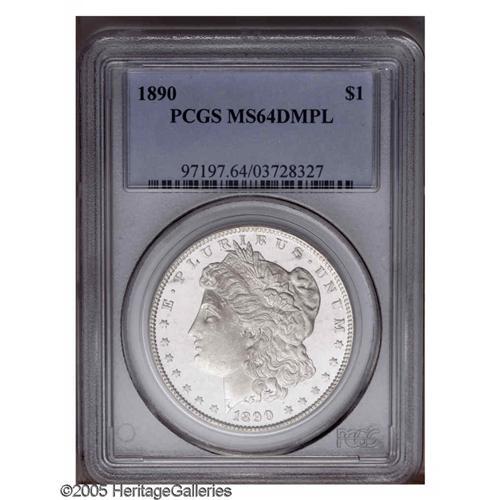 <B>1890<S$1> MS64 Deep Mirror Prooflike PCGS.</B></I> VAM-4. A flashy near-Gem that exhibits noticeable contrast between the devices and fields, particularly on the reverse. Nearly brilliant, a few light grazes on the cheek and left obverse field are appropriate for the grade. The 90 in the date is widely recut north. Population: 67 in 64 DMPL, 5 finer (11/05).