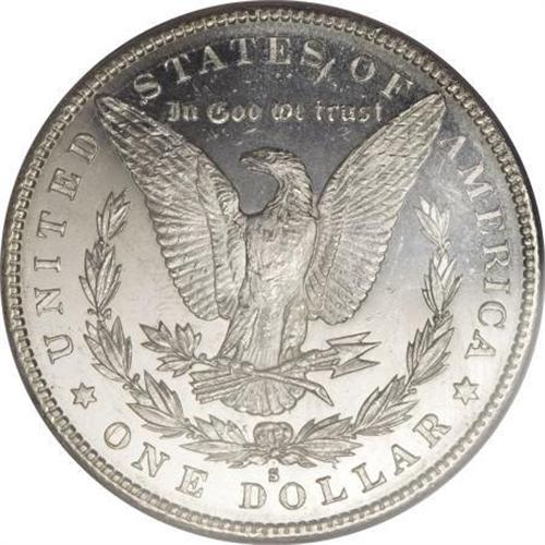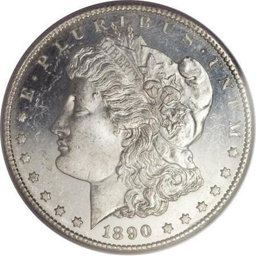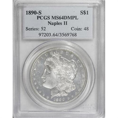 <B>1890-S $1 MS64 Deep Mirror Prooflike PCGS.</B></I> Ex: Naples II. According to Bowers, "DMPL coins are rare in higher grades." This near-Gem is bright and brilliant, with glassy reflectivity and frequent die polish lines in the fields that only increase the deeply prooflike appearance of the piece. Only modest cloudiness occurs on either side, and a few scuffy marks in the left obverse field limit the grade. Population: 24 in 64 Prooflike, 8 finer (6/07). <BR><I>From the Diamond Head Collection.</B></I><BR><BR><b>Shipping:</b> Coins & Currency (<a target="_blank" href="http://www.heritageauctions.com/common/shipping.php">view shipping information</a>)