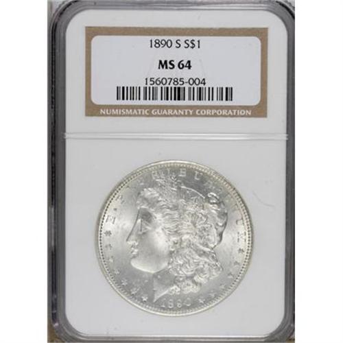 <B>1890-S $1 MS64 NGC.</B></I> NGC Census: (1726/318). PCGS Population (2220/640). Mintage: 8,230,373. Numismedia Wsl. Price for NGC/PCGS coin in MS64: $220. (#7202)<BR><BR><b>Shipping:</b> Coins & Currency (<a target="_blank" href="http://www.heritageauctions.com/common/shipping.php">view shipping information</a>)
