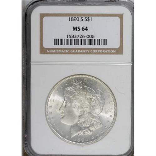 <B>1890-S $1 MS64 NGC.</B></I> NGC Census: (1745/322). PCGS Population (2278/656). Mintage: 8,230,373. Numismedia Wsl. Price for NGC/PCGS coin in MS64: $220. (#7202)<BR><BR><B>Coin Engraver:</B> George T. Morgan<BR><BR><b>Shipping:</b> Coins & Currency (<a target="_blank" href="http://www.heritageauctions.com/common/shipping.php">view shipping information</a>)