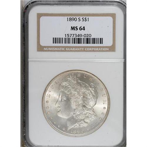 <B>1890-S $1 MS64 NGC.</B></I> NGC Census: (1745/322). PCGS Population (2296/660). Mintage: 8,230,373. Numismedia Wsl. Price for NGC/PCGS coin in MS64: $220. (#7202)<BR><BR><B>Coin Engraver:</B> George T. Morgan<BR><BR><b>Shipping:</b> Coins & Currency (<a target="_blank" href="http://www.heritageauctions.com/common/shipping.php">view shipping information</a>)