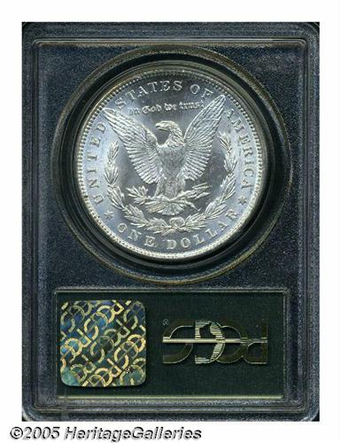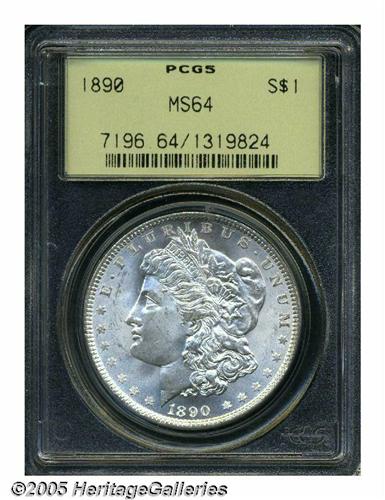 <B>1890<S$1> MS64 PCGS.</B></I> Mint State 1890 dollars are common in the lower ranges of MS60 through MS63, where hundreds of thousands survive. MS64 coins are harder to find, while MS65 specimens are surprisingly rare. This piece has flashy, essentially untoned surfaces with bright, radiant luster. The design features are well impressed, though the hair over Liberty's ear is soft. Minor luster grazes on Liberty's face limit the grade.<BR><I>From The Milwaukee Shore Collection.</B></I>