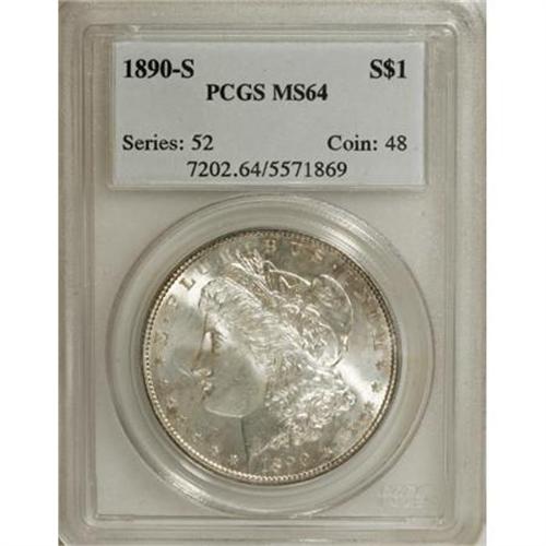 <B>1890-S $1 MS64 PCGS.</B></I> PCGS Population (2254/652). NGC Census: (1737/321). Mintage: 8,230,373. Numismedia Wsl. Price for NGC/PCGS coin in MS64: $220. (#7202)<BR><BR><B>Coin Engraver:</B> George T. Morgan<BR><BR><b>Shipping:</b> Coins & Currency (<a target="_blank" href="http://www.heritageauctions.com/common/shipping.php">view shipping information</a>)