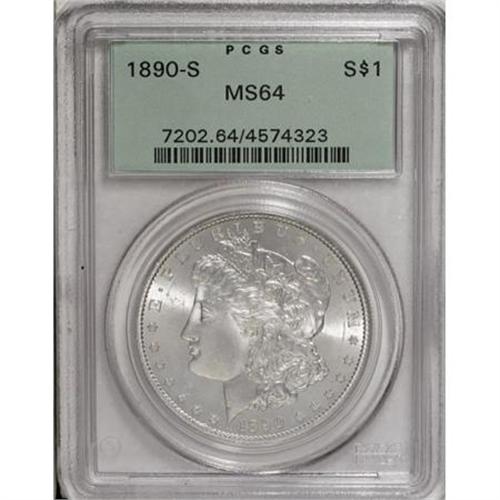 <B>1890-S $1 MS64 PCGS.</B></I> . PCGS Population (2328/670). NGC Census: (1779/325). Mintage: 8,230,373. Numismedia Wsl. Price for NGC/PCGS coin in MS64: $215. (#7202)<BR><BR><B>Coin Engraver:</B> George T. Morgan<BR><BR><b>Shipping:</b> Coins & Currency (<a target="_blank" href="http://www.heritageauctions.com/common/shipping.php">view shipping information</a>)