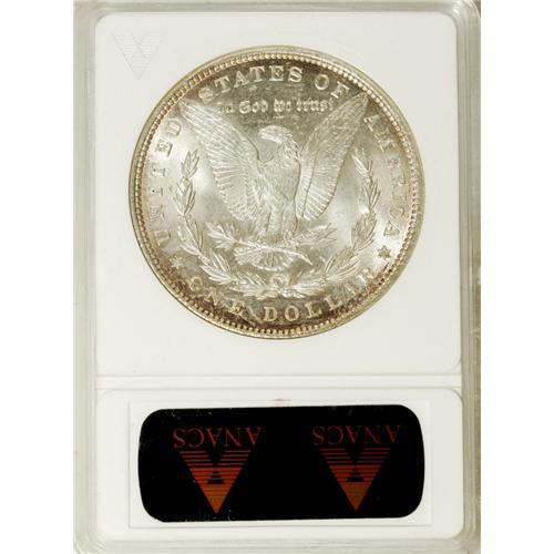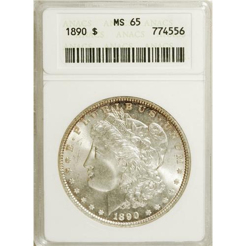 <B>1890 S$1 MS65 ANACS.</B></I> David Bowers (2006) writes that the 1890 " ... Philadelphia Mint Morgan is very common in low Mint State levels but is quite rare in sharply struck MS-65." The Gem in this lot reveals a sharp strike, resulting in good definition in the hair over Liberty's ear and on the eagle's breast feathers. Intense luster shows light red toning at the peripheries. Both sides are minimally abraded. Virtually unobtainable any finer.<BR><BR><b>Shipping:</b> Coins & Currency (<a target="_blank" href="http://www.heritageauctions.com/common/shipping.php">view shipping information</a>)