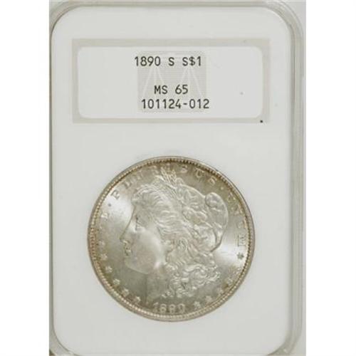 <B>1890-S $1 MS65 NGC.</B></I> Light gold and cherry-red toning endow this lustrous better date dollar. The eagle's breast has a minor graze. Housed in a former generation holder.<BR><I>Ex: Long Beach Bullet (Heritage, 5/96), lot 305.</B></I><BR><BR><B>Coin Engraver:</B> George T. Morgan<BR><BR><b>Shipping:</b> Coins & Currency (<a target="_blank" href="http://www.heritageauctions.com/common/shipping.php">view shipping information</a>)