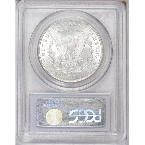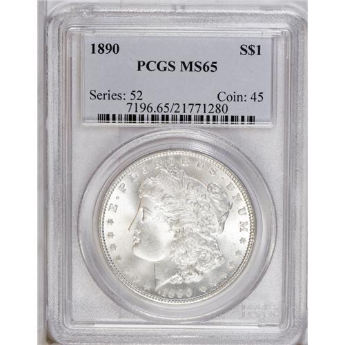 <B>1890<img border='0' src='http://www.heritagecoins.com/images/star.gif' width=10 height=10>$1> MS65 PCGS.</B></I> A satiny Gem with slight striking weakness typical of the issue. Only a few marks appear on the coin, the most notable of which appears in the field behind the head. Surprisingly scarce in Gem grades.<BR><I>From The Chicago-Ark Collection.</B></I>