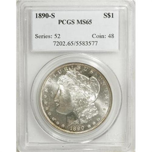 <B>1890-S $1 MS65 PCGS.</B></I> A splendid Gem with a fully brilliant, prooflike obverse and a frosty reverse, accompanied by dusky, speckled toning.<BR><BR><B>Coin Engraver:</B> George T. Morgan<BR><BR><b>Shipping:</b> Coins & Currency (<a target="_blank" href="http://www.heritageauctions.com/common/shipping.php">view shipping information</a>)