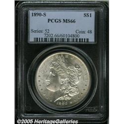 <B>1890-S<img border='0' src='http://www.heritagecoins.com/images/star.gif' width=10 height=10>$1 MS66 PCGS.</B></I> At a time when other mints (particularly New Orleans) were producing rather shoddy coinage, the San Francisco Mint was turning out a wonderful product. This is a gorgeous Gem with snow-white color and frosty luster. Both sides have excellent design detail, typical of this issue. Population: 99 in 66, 5 finer (2/05).