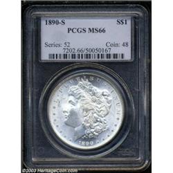 <table><tr><td><TABLE cellSpacing=0 cellPadding=0 width="100%" bgColor=#000000 border=0><TBODY> <TR><TD width="100%"><TABLE cellSpacing=1 cellPadding=3 width="100%" border=0><TBODY><TR><TD width="100%" bgColor=#79735c><FONT face=arial color=#ffffff size=3><B>Description</B> </FONT></TD></TR><TR><TD width="100%" bgColor=#ffffff><FONT face=arial size=2><B>1890-S $1 MS66 PCGS.</B></I> While 8.2 million pieces were struck of the 1890-S, most apparently entered circulation at the time of issue or were released at later dates. Which means that high grade examples such as this are very difficult to locate. This is a brilliant, highly frosted coin that is sharply struck and shows only the slightest luster grazes over each side. Population: 95 in 66, 5 finer (10/03). </FONT></TD></TR></TBODY></TABLE></TD></TR></TBODY></TABLE><BR><A name=PricesRealized></A><TABLE cellSpacing=0 cellPadding=0 width="100%" bgColor=#000000 border=0><TBODY><TR><TD width="100%"><TABLE cellSpacing=1 cellPadding=3 width="100%" border=0><TBODY><TR><TD width="100%" bgColor=#79735c><A name=PR><FONT face=arial color=#ffffff size=3><B>Previous Prices from Heritage Auctions</B> </FONT></A></TD></TR><TR><TD bgColor=#f6f6ed><TABLE cellSpacing=0 cellPadding=0 width="100%" border=1><TBODY><TR><TD align=middle width="33%"><B>Date</B></TD><TD align=middle width="33%"><B>Service</B></TD><TD align=middle width="33%"><B>Price</B></TD></TR><TR bgColor=whitesmoke><TD width="33%"><B>03/23/2003</B></TD><TD width="33%">PCGS</TD><TD width="33%">$4,025.00</TD></TR><TR bgColor=whitesmoke><TD width="33%"><B>01/11/2003</B></TD><TD width="33%">PCGS</TD><TD width="33%">$3,105.00</TD></TR><TR bgColor=whitesmoke><TD width="33%"><B>11/23/2002</B></TD><TD width="33%">PCGS</TD><TD width="33%">$2,530.00</TD></TR><TR bgColor=whitesmoke><TD width="33%"><B>01/12/2002</B></TD><TD width="33%">PCGS</TD><TD width="33%">$2,415.00</TD></TR><TR bgColor=whitesmoke><TD width="33%"><B>05/31/2001</B></TD><TD width="33%">PCGS</TD><TD width="33%">$3,105.00</TD></TR><TR bgColor=whitesmoke><TD width="33%"><B>10/06/2000</B></TD><TD width="33%">PCGS</TD><TD width="33%">$2,875.00</TD></TR><TR bgColor=whitesmoke><TD width="33%"><B>01/07/2000</B></TD><TD width="33%">PCGS</TD><TD width="33%">$2,875.00</TD></TR><TR bgColor=whitesmoke><TD width="33%"><B>09/13/1997</B></TD><TD width="33%">PCGS</TD><TD width="33%">$2,300.00</TD></TR><TR bgColor=whitesmoke><TD width="33%"><B>08/17/1996</B></TD><TD width="33%">PCGS</TD><TD width="33%">$1,760.00</TD></TR><TR bgColor=whitesmoke><TD width="33%"><B>02/01/2000</B></TD><TD width="33%">NGC</TD><TD width="33%">$1,121.00</TD></TR><TR bgColor=whitesmoke><TD width="33%"><B>03/01/1999</B></TD><TD width="33%">NGC</TD><TD width="33%">$1,610.00</TD></TR><TR bgColor=whitesmoke><TD width="33%"><B>03/01/1999</B></TD><TD width="33%">PCGS</TD><TD width="33%">$2,760.00</TD></TR></TBODY></TABLE></TD></TR><TR><TD bgColor=#ffffff><FONT face=arial size=1 ?>PLEASE NOTE: All prices realized reflect the final hammer price PLUS the buyer's premium in auctions that charge a buyer's premium. Each item has a notation at the top of the listing indicating whether that lot included a buyer's premium. Example: A item that sells with a final hammer price of $100 and a 20% buyer's premium will display with a price realized of $120. All information listed is intended to be as accurate as possible, but errors are possible. Please use this guide carefully and inform us of any inaccuracies. </FONT></TD></TR></TBODY></TABLE></TD></TR></TBODY></TABLE><BR><TABLE cellSpacing=0 cellPadding=0 width="100%" bgColor=#000000 border=0><TBODY><TR><TD width="100%"><TABLE cellSpacing=1 cellPadding=3 width="100%" border=0><TBODY><TR><TD width="100%" bgColor=#79735c colSpan=6><FONT face=arial color=#ffffff size=3><B>Price Guide*</B> </FONT></TD></TR><TR bgColor=#f6f6ed><TD align=middle><B>Grade</B> </TD><TD align=middle><B>Coin World<BR>(Trends)</B> </TD><TD align=middle><B>Numismedia<BR>Retail</B> </TD><TD align=middle><B>Numismedia<BR>Wholesale</B> </TD><TD align=middle><B>Coin<BR>Universe</B> </TD><TD align=middle><B>Heritage<BR>Value Index</B> </TD></TR><TR bgColor=#ffffff><TD align=middle>65</TD><TD align=right>$1,100.00</TD><TD align=right>$930.00</TD><TD align=right>$740.00</TD><TD align=right>$935.00</TD><TD align=right>$669.25</TD></TR><TR style="FONT-WEIGHT: bold" bgColor=#cccfdd><TD align=middle>66</TD><TD align=right>$3,000.00</TD><TD align=right>---</TD><TD align=right>$3,025.00</TD><TD align=right>$3,500.00</TD><TD align=right>$2,246.25</TD></TR><TR bgColor=#ffffff><TD align=middle>67</TD><TD align=right>---</TD><TD align=right>---</TD><TD align=right>$6,500.00</TD><TD align=right>$9,000.00</TD><TD align=right>$5,625.00</TD></TR><TR bgColor=#ffffff><TD colSpan=6><FONT size=1>*All information listed is intended to be as accurate as possible, but errors are possible. No item may be returned or refused based on this information which is provided as a service to our customers. You should contact each pricing source directly to determine the accuracy of this information. </FONT></TD></TR></TBODY></TABLE></TD></TR></TBODY></TABLE><BR><TABLE cellSpacing=0 cellPadding=0 width="100%" bgColor=#000000 border=0><TBODY><TR><TD width="100%"><TABLE cellSpacing=1 cellPadding=3 width="100%" border=0><TBODY><TR><TD width="100%" bgColor=#79735c><FONT face=arial color=#ffffff size=3><B>Population Guide</B> </FONT></TD></TR><TR bgColor=#ffffff><TD align=middle><!-- Begin Output of Population Grid--><TABLE cellSpacing=0 cellPadding=0 width="100%" border=0><TBODY><TR><TD vAlign=center><TABLE cellSpacing=0 width="100%" border=1 cellsadding="3"><TBODY><TR><TD vAlign=center><TABLE cellSpacing=0 cellPadding=3 width="100%" border=1><TBODY><TR><TD vAlign=center align=middle bgColor=#f0f1e8 colSpan=2 <CENTER><FONT face=Arial size=2><B>PCGS Pop </B></FONT><CENTER></CENTER></TD><TD vAlign=center align=middle bgColor=#f0f1e8 colSpan=2><CENTER><FONT face=Arial size=2><B>NGC Pop</B></CENTER></FONT></TD></TR><TR