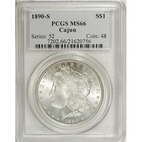 <B>1890-S $1 MS66 PCGS.</B></I> Ex: Cajun Collection. Vibrant luster radiates from both sides of this Premium Gem, and the usually seen sharp strike characteristic of this issue brings out strong definition on all of the design features. While appearing color-free at first glance, close inspection displays faint hints of light tan color at the margins. A few minute marks and luster grazes do not disturb.<BR><I>From the Reuben Reinstein Collection.</B></I><BR><BR><b>Shipping:</b> Coins & Currency (<a target="_blank" href="http://www.heritageauctions.com/common/shipping.php">view shipping information</a>)